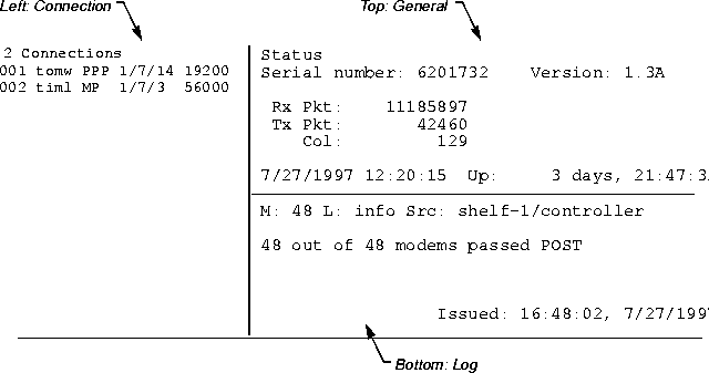 The MAX TNT generates a continuous stream of statistics about its activities. You can specify in a User profile that these statistics should always be displayed when a user logs in with that profile. Or, you can simply display the status window on demand.